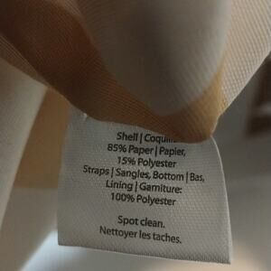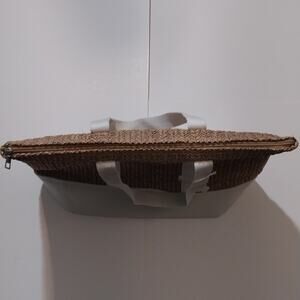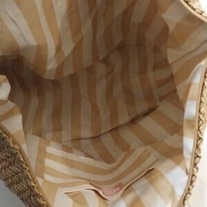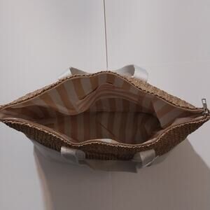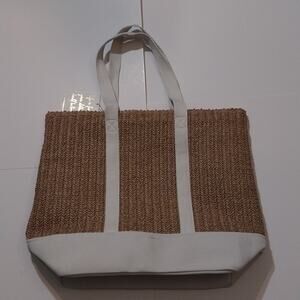 This adventurous tote bag is brand new. color is natural and ivory. canvas and sturdy paper straw material. slushy round shape.
