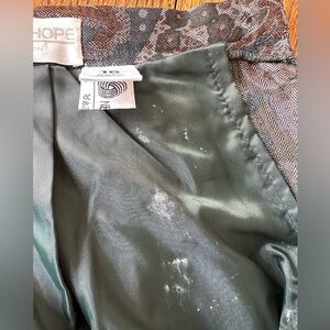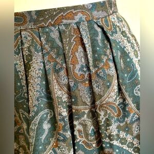 Kerry Hope of London, size 16 skirt. Deep turquoise, evergreen, gray, olive and gold paisley. 100% wool. Two side pockets. Fully lined. Lining has some white marks (dry cleaning residue?). Just professionally cleaned. Excellent condition.