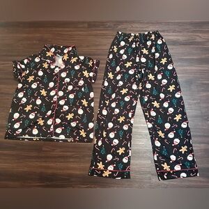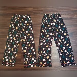 Cozy & soft pajama sets with a festive holiday print. Features Santa, gingerbread men, and candy canes on a black background. Unisex. One set is large top & bottom. Other set is large top & medium bottom. See photo of bottoms: left is the medium & right is the large. We liked the roomier tops :) Worn & washed once. Price is for both sets, all 4 pieces.