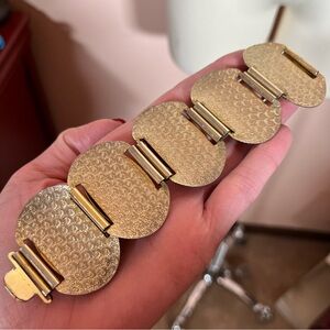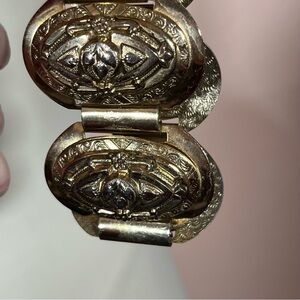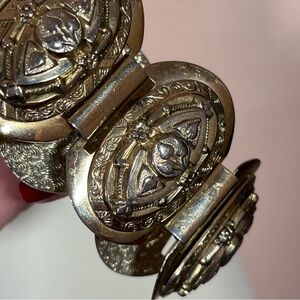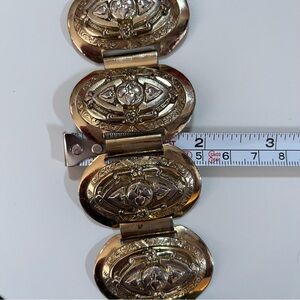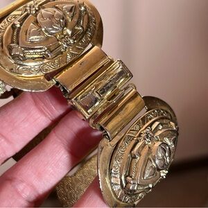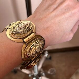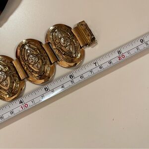 Get ready to slay the dragon with this vintage bracelet. Lovely raised panels of ornate flowers with a tongue and groove clasp. Each panel has raised images, etching with a shield like design. Slight vintage wear throughout with some spots of gold lose giving an antique finish. Heavy well made bracelet.