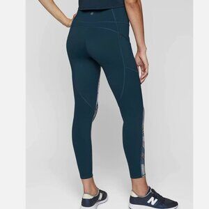 #2 Athleta Oasis Contender Leggings Lagoon Teal 7/8 Tight - print on front, solid teal on back, 2 hip zip pockets, 78% polyester 22% lycra