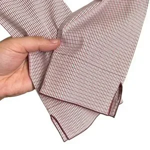 Very elegant snap closure button down shirt with unique gingham style pattern. Split cuffs with contract trim. Cutaway collar. Beautiful smooth fabric. Off white with muted pink and olive green colors.