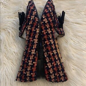 Elegant tweed loafers with a stylish navy and orange pattern. Features chic tassel accents. Perfect for versatile wear.(O7)
