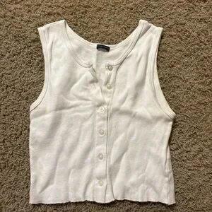 Chic white crop top with button-up front. Sleeveless design. Ideal for casual wear.