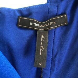 BCBG Maxazria woman's "Harlie" dress in royal blue. Dress is a sleeveless V neck with front and side cut outs. It's made of polyester and spandex and is a woman's size 12. Dress is brand new with tags. Org. list price $338.