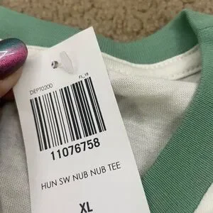White t-shirt featuring a Nub Nub graphic. Green trim on sleeves and collar.