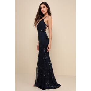 NWT Lulus Valhalla Navy Blue Sequin Lace-Up Maxi Dress Banquet Gala NYE Glam L