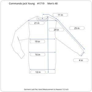 Vintage “Commando by Jack Young” military sweater in heavyweight black wool, tagged size 48 (fits like Men’s Large). Built to USMC specs with reinforced shoulder and elbow patches, ribbed cuffs, and classic V-neck design. Made in Hazleton, PA, 100% wool body and poly/cotton overlays. Durable, American-made construction built to last.