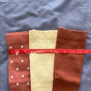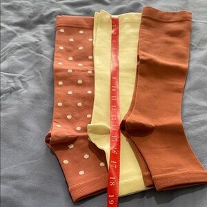 Set of light support toeless stockings for better circulation size L/XL the cream colored ones worn once other 2 are new only opened for pictures colors are rust and pinkish rust with polka dots