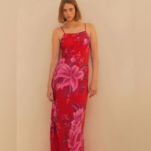 FARM Rio. The dress dances with bold pink floral patterns against a rich red backdrop, capturing the warmth of summer. Its flattering square neckline and sleek silhouette create a feminine allure, while