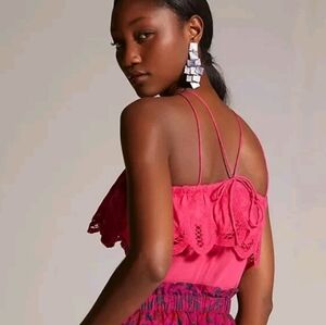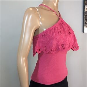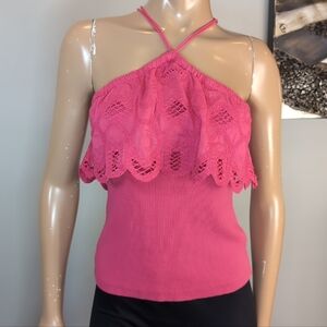 Anthropologie Ruffled Halter Top Womens XS Pink Embroidered Crochet Tank Blouse