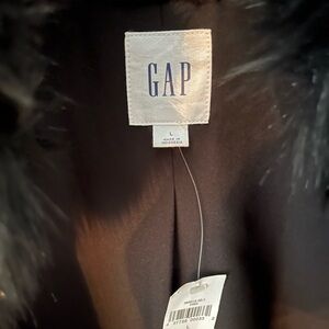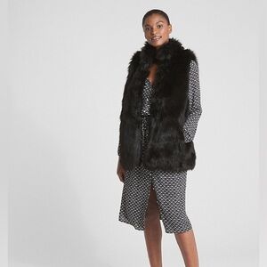 GAP Women's Black Faux Fur Vest. Size Large. NWT. Pit to pit about 22.5”. From back of neck down measures about 31.5”. Soft plush faux-fur vest. Stretch twill lining. Hook and eye closure. Slant pockets at hips. 100% acrylic.