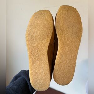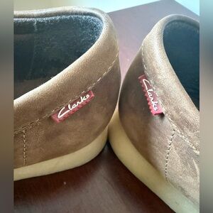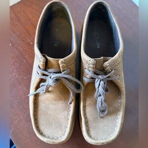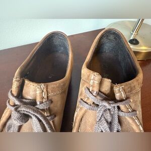 Brown leather wallabees. Comfortable and stylish. Lightly worn. Has some wear, shown in pictures but in really good condition. There is a droplet of some sort on the side. I have not tried treating it. It maybe could come off with just some warm water.