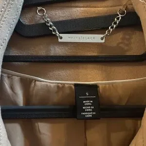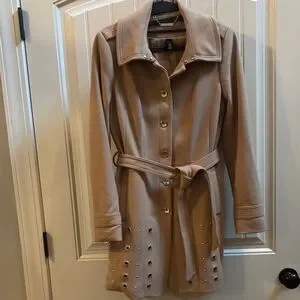Chic tan trench/ Peacoat with stylish gold accents. Features button closure and belted waist. Ideal for a sophisticated look.