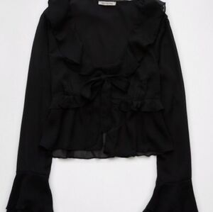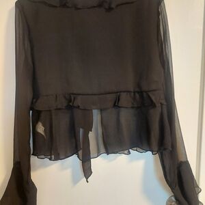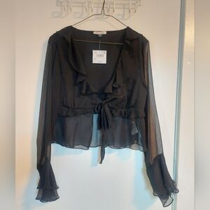 Chic black sheer blouse with ruffle accents. Features a stylish tie-front. Perfect for versatile styling.