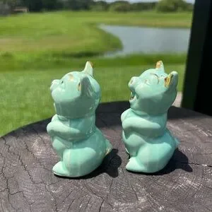This product is a set of two vintage green salt shakers featuring little pig characters with gold trim. Made of ceramic, each shaker is designed in a charming animal theme, perfect for adding a touch of whimsy to any kitchen or dining room decor. The set includes two salt shakers with a matching pig design, making them a delightful collectible for those who appreciate vintage kitchen tools and gadgets.