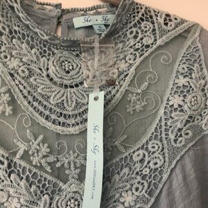 Elegant light blue top featuring intricate lace details. New with tags in perfect condition. Coming from no pet no smoking home.