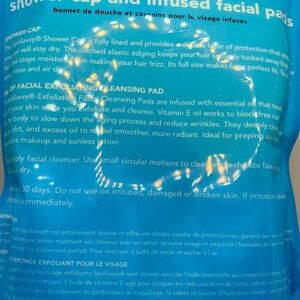 Shower cap and 2 facial pads Aloe infused! Shower cap is turquoise and facial pads are green! Helps you relax in shower! BRAND NEW IN PACKAGING!