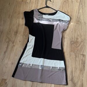 Chic mini dress by VENUS. Features bold black and gray blocks. Silver sequin accents add sparkle. Perfect for a night out. Length 33 in. Super stretchy. A line cut is very flattering.