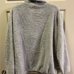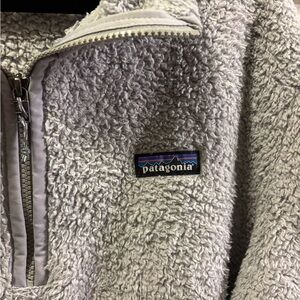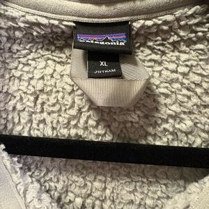 Soft sherpa fleece jacket by Patagonia. Light gray color. Comfortable and warm.