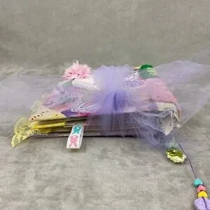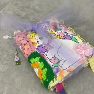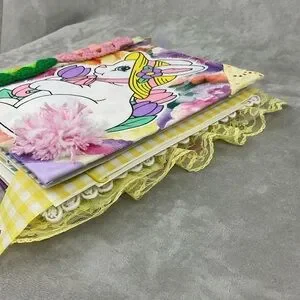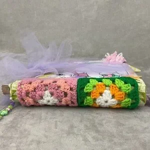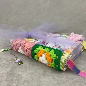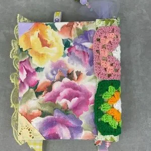 Hard cover covered in a vibrant cheerful floral fabric with crochet granny squares adorning the spine. Completely removable purple tulle wrapped closure