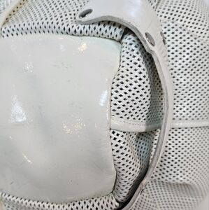 Add a touch of vintage glamour to your collection with this stunning Kooba White Mesh Leather Hobo Bag! Crafted with a distinctive white mesh leather body, this bag features a breathable, perforated design that sets it apart, paired with smooth white leather accents for a luxurious finish. The bag boasts a spacious, slouchy silhouette with a secure zippered top closure, perfect for everyday essentials. It includes adjustable leather straps with metallic studs and rings, offering versatile styling options as a shoulder or crossbody bag.