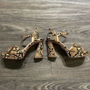Katy Perry Size 8 38 Square Platform Sandals Snake Print Brown Tan Chunky Heels