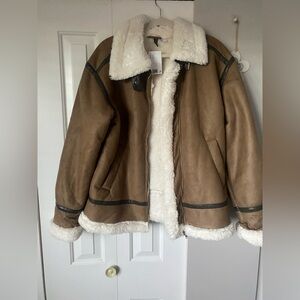 H&M Tan Jacket with Cream Shearling Collar size S oversized