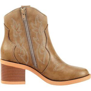 Women Polyurethane Mocha Embroidered Round Toe Short Ankle Chunky Heel Boot