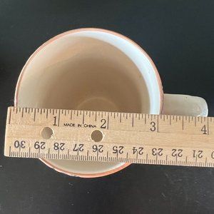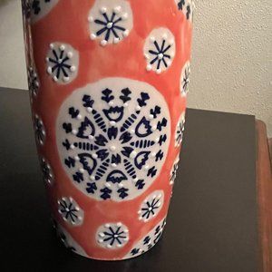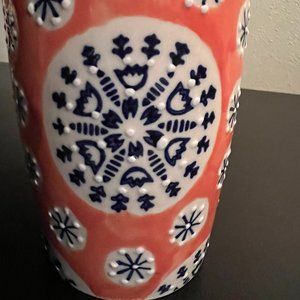 Beautiful vintage Deauville Veda Dining glazed ceramic mug with wrap-around raised dot design in burnt orange with floral navy blue and white circular patterns.