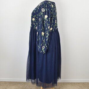 Mesh overlay. Long sleeve. Sweetheart neckline. Back zipper. Elastic sleeve cuffs. Fully lined. Midi lenght.