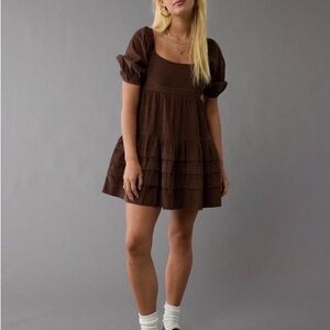 Chic brown dress with puff sleeves and tiered design. Perfect for casual outings.