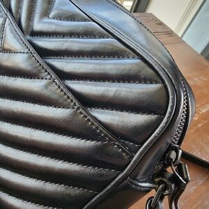 Saint Laurent Black medium Quilted Leather Crossbody Camera Bag with black YSL symbol. This elegant accessory features a sleek design and a convenient tassel detail, perfect for any occasion.