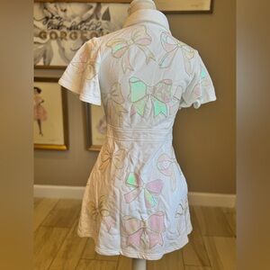 New! QUEEN OF SPARKLES White and Iridescent Pink Metallic Bow Mini Dress