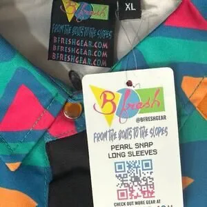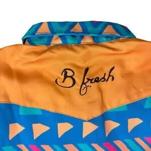 Details: Western-inspired long sleeve shirt with a bold 90s edge. Features color-coordinated pearl snap buttons, pearl snap cuffs, and two front pockets. Designed with an extra-long length so it stays tucked in while moving. Embroidered “B fresh” detail across the back shoulders adds standout character. 90% polyester, 10% cotton, durable construction and sold out online. Originally $70. Unisex fit.