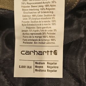 Durable and warm Carhartt jacket. Ideal for outdoor activities. Features a hood and zip closure.