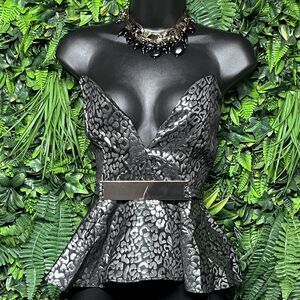 SAN JOY Tops Women Small Black Silver Animal Print Strapless Peplum Blouse 2515
