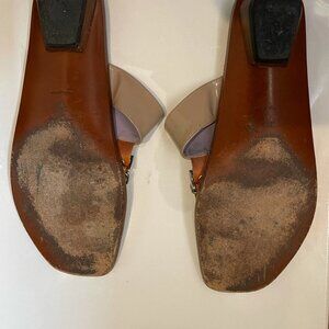 Beautiful Prada sandals with leather thong detail and patent lilac strap. Size 9/39. In extremely good condition with some light discoloration on the side as pictured. Comes with dust bags.