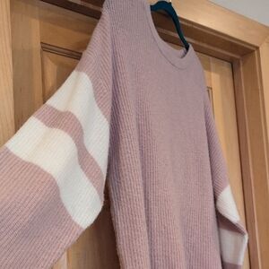 Stylish crew neck sweater by John + Jenn. Features a pink body with cream sleeve accents. Ideal for casual wear.