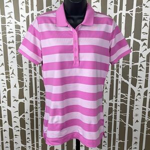 Nike Golf Tour Performance Dri-Fit Golf Shirt - Pink Stripes - Barbiecore. Features light and mid-tone pink striped Dry-Fit Fabric which is soft and stretchy. Gently worn and laundered with a few very small snags (see pics). Size M - Measurements taken laying flat are approximately: 19.5" pit to pit, 26.5" top of shoulder to hem, 8" sleeve length. Pink is so hot right now!