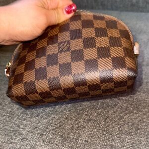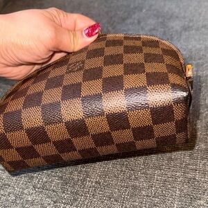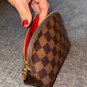 Louis Vuitton brown damier ebene cosmetic pouch. Elegant pouch with vibrant red interior. Ideal for storing essentials. Can also be use as a small purse. Gentle use. Tried to capture the date code but it’s impossible.