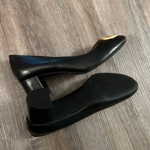 Elegant black heels with gold logo detail. Perfect for any occasion.