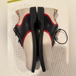 Sophisticated Burberry oxfords with a bold red accent. Classic black and cream design. Perfect for formal occasions.are not sure the size please see picture measurements please maybe it’s 11/5 or 12
