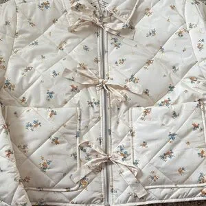 Stylish cream bomber jacket with floral pattern. Features quilted design and zipper/bow closures. Perfect for casual wear.