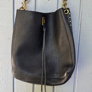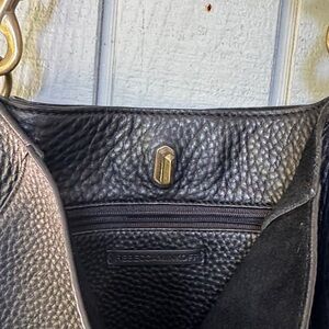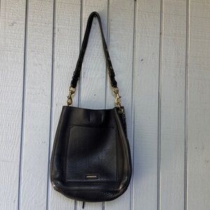 Elegant black leather shoulder bag with gold accents. Features a front pocket and adjustable strap.