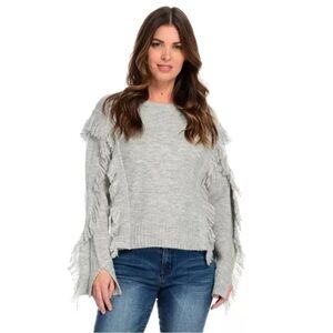 Stay cozy and stylish with this chic gray fringe sweater. Perfect for any casual outing.
