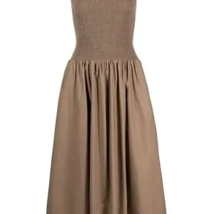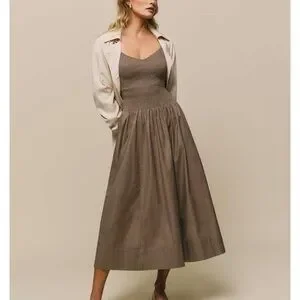 Chic taupe midi dress with a fitted bodice. Flowy skirt for elegant movement. Ideal for versatile styling.