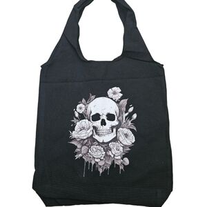 Stylish tote bag featuring a striking floral skull design. Perfect for adding an edgy touch to your outfit.