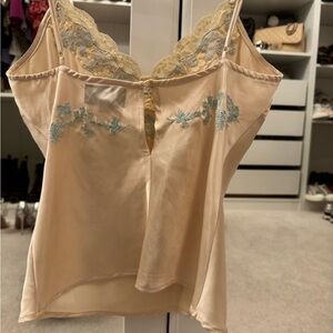 This elegant women's top features a beautiful cream color with delicate blue lace trim. Perfect for adding a touch of sophistication to any outfit.