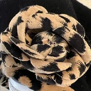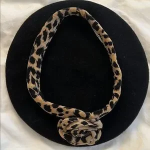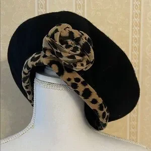 Chic Vintage Black Beret with Leopard Trim and accent Flower. In excellent condition.